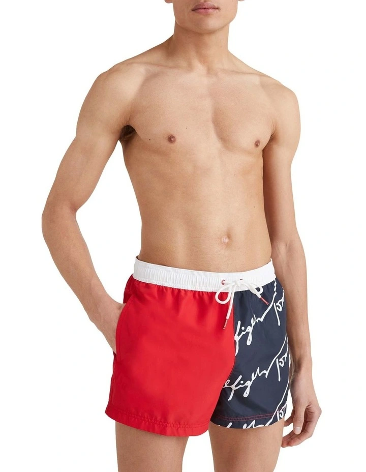 Sign yourself at the beach the Tommy Hilfiger way with these bold, colour-blocked swim shorts in a shorter length and featuring polygiene technology.Β